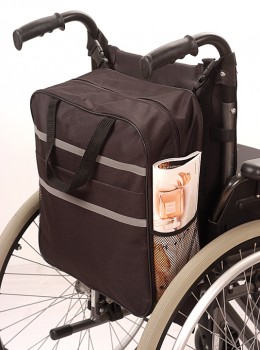 Práctica bolsa impermeable. Se puede colgar de los puños en la parte trasera de la silla de ruedas y también tiene unas asas largas para llevársela.