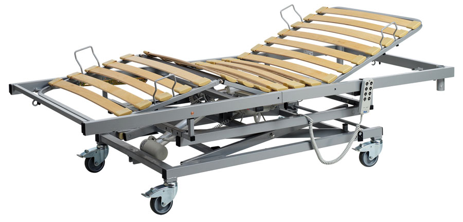 Cama electrónica con somier de 4 planos y carro elevador, de altura regulable de 40 cm a 80 cm. Robusta y resistente, diseñada para