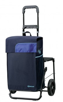 Práctico carrito con asiento plegable fabricado en Alemania, es ligero y resistente y va equipado con: bolsillo interior con cremallera, departamento isotérmico, bolsillo para paraguas, reflectantes y bolsa de 43 litros extraíble.
