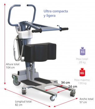 La grúa de bipedestación y traslado «Way Up» es la más pequeña y ligera existente. Ultra compacta, 82 cm de largo por 57 cm. de ancho y con un peso de apenas 28 Kg. la convierten en una grúa de bipedestación extraordinariamente maniobrable y versátil.