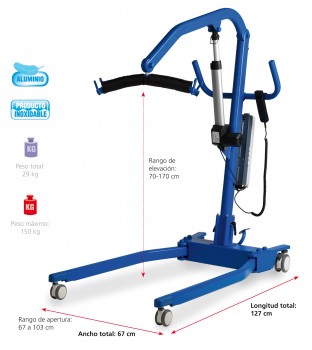 Grúa ligera de última generación, fabricada en aluminio para facilitar la labor de los cuidadores al proporcionarles una grúa más ligera y fácilmente maniobrable aun en condiciones de uso intensivo