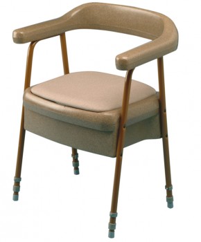 Cómoda silla con asiento acolchado, con inodoro incorporado y de altura graduable. Posee un aspecto atractivo que disimula perfectamente su función. La cubeta de plástico, con tapa y asa, se puede sacar para evacuarla y facilitar su limpieza.